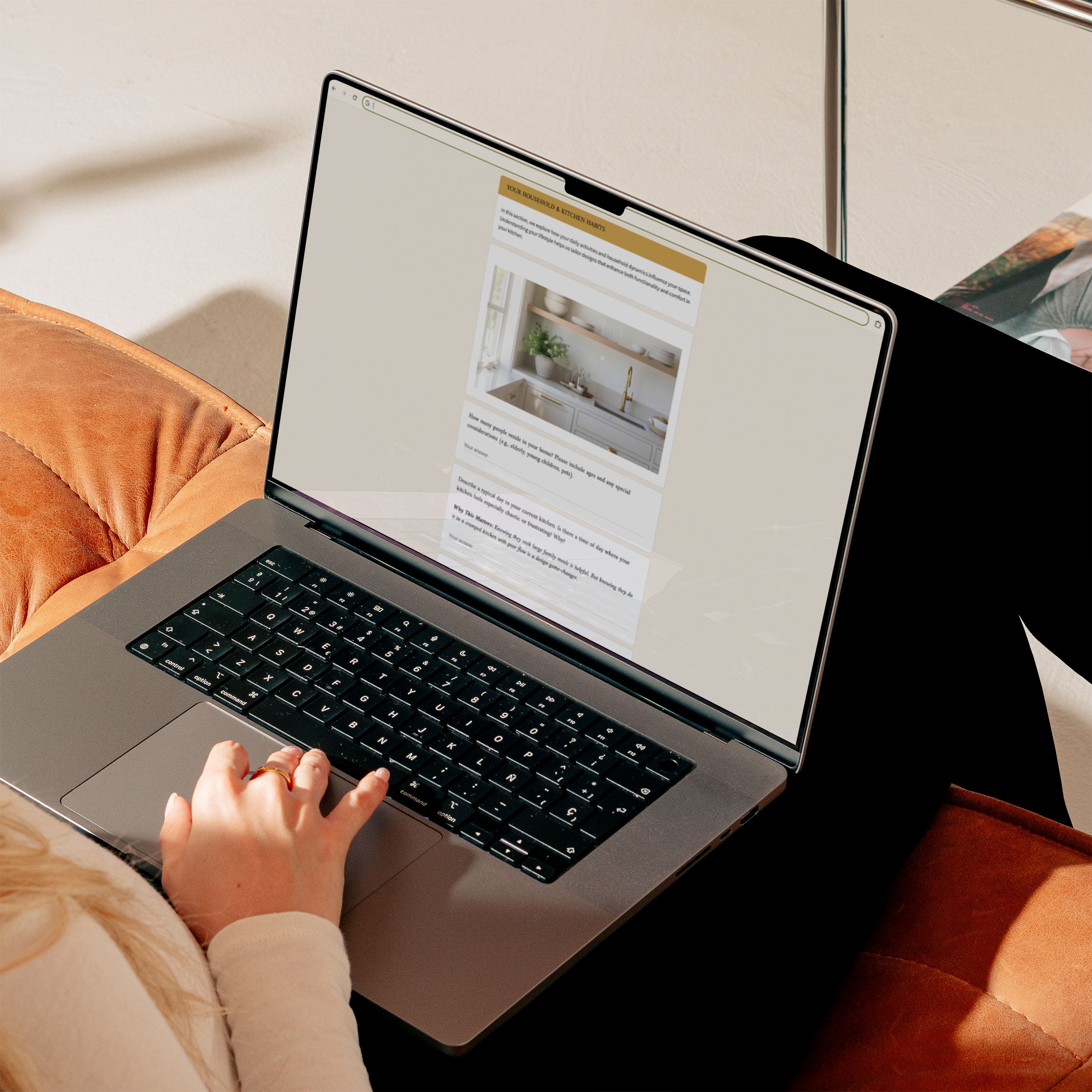 A digital version of an interior design discovery questionnaire displayed on a tablet, resting on a wicker table.